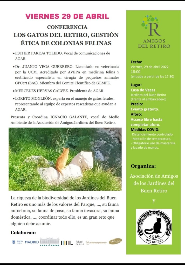 De la mano de nuestros amigos de la Asociación de Amigos de los Jardines del Buen Retiro y con la participación del Dr. veterinario Juanjo Vega, Loreto Monleón y destacadas miembros de Agar.